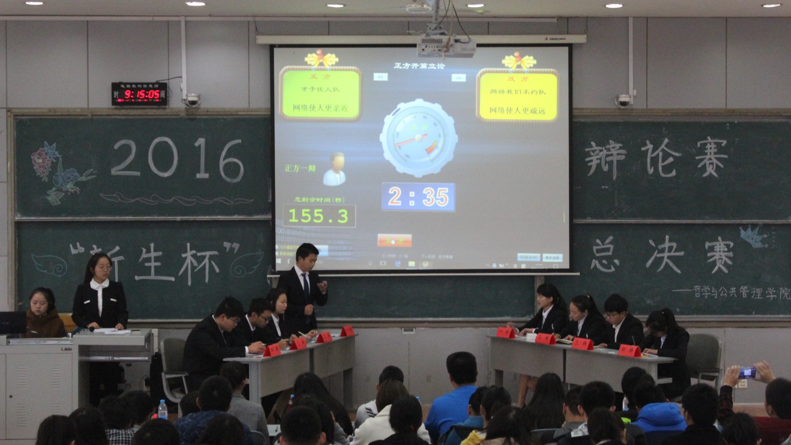 决赛分为两场,共有四支队伍,分别以“网络使人更亲近还是更疏远”和“网络文学是否有利于文化发展”为辩题展开比赛。第一场正反两方分别从网络促进信息传递便捷化和网络客主体具有虚拟性来论证己方观点。对辩环节中,正方以网络是工具,重点是使用者为依据对反方展开攻辩,反方以拉进距离不等于心灵亲近的观点作为回应。双方唇枪舌剑,各展所长。第二场正方从网络文学是文学发展新常态,具有商业结合倾向和两面性等方面论证己方观点。反方则从网络文学的特点现状、影响和文化发展需求等方面论证观点。在之后的对辩、盘问环节中,双方发言争锋相对,你来我往,博得观众阵阵掌声。在总结陈词环节,正反两方分别指出对方漏洞,分析总结,再次重申观点。两场比赛结束后,在场评委对四支队伍表现做出精彩点评。最终,无敌小可爱队夺得冠军,同时,何政蓄、李笑帆获优秀辩手称号。