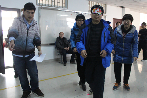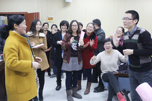 乒乓球比赛时,参赛老师各个技术高超,哲学队以平稳的发挥取得该项目的胜利。你比我猜游戏要搭档用动作或语言表达出给定的词汇,提示队友说出给定词汇,在限定时间内回答正确的数量多的小组获胜。比赛各队滑稽的动作让在场教师大笑不已。在盲人击鼓环节,敲鼓的老师要站在四米远的起点,蒙住眼转五圈,向前走摸索敲三下,敲中鼓者为先胜队,老师们在活动中表现精准让在场所有人员振奋与欢呼。