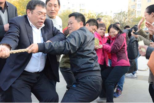 拔河比赛采取三局比赛制,由八名教师两名员工组成队伍。第一局政治队对管理队,在前两局平局的情况下,管理队老师及时运用专业知识对队伍进行优化调整,以绝对的优势战胜政治队。在哲学队与行政队的比赛中,两队伍实力相当,队员个个压低重心,脚跟紧贴地面,使红线反复易主,比赛现场加油声、呐喊声此起彼伏,最终行政队艰难取得本局的胜利。经决赛比拼,管理队取得了拔河的胜利。