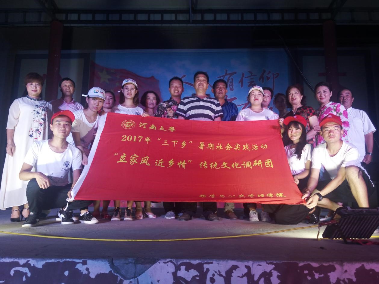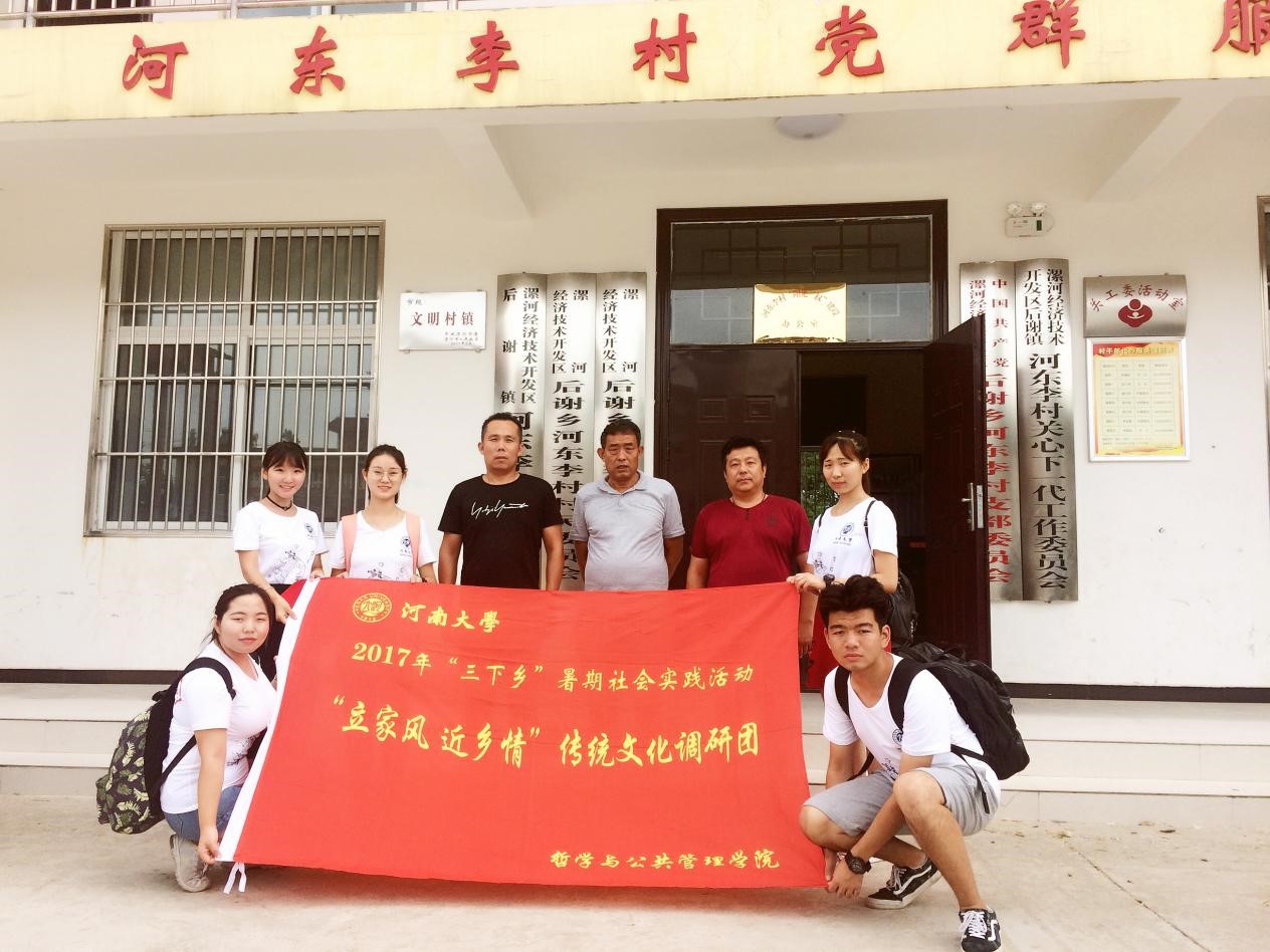 调研的第一站,他们来到了位于河南省漯河市后谢镇的河东李村。走进村中的大门,久违的家风乡情在这里随处可见,无论是路灯牌上村里的“好媳妇”、“好婆婆”宣传画,还是道路两旁的巨幅孝道墙绘,都在向团队成员们传递着来自于这个村庄家风乡情的脉搏。从村两委领导的口中,团队成员们了解到河东李村在先前的很长时间里都是一个小小的自然村,在近几年才成为独立的行政村,因此,河东李村的经济发展起步较晚,发展过程中也遇到了不少的阻力。村干部表示,下一步,村两委还将根据村里的实际情况,引进更加适宜的农业作物在村中进行推广种植,在提高村民收入的基础上形成一套有河东李特色的农业发展致富体系,带领村民共同提高生活水平走向富裕。虽然村民的普遍收入和生活水平不高,但长期以来,河东李村一直保持着先前优秀的家风乡情,备受周边村落的赞誉和好评。在河东李村的五天时间里,团队成员们陆续走访了村中包括村干部、“好媳妇”、“好婆婆”、乡贤、退休教师在内的多个群体,对河东李村的优秀家风乡情文化有了更加深入的认识和把握。调研过程中,团队成员参加了村党支部每月定期举行的主题党日活动,也加入了村中激情洋溢的广场舞;观看了文明乡风的巡演,也参加了“好媳妇”表彰大会,同时也与来村中考察的漯河市文明办主任和后谢镇党委书记热情交谈。认真观察、用心倾听,团队成员们用问卷、镜头和访谈记录勾勒出河东李村真实动人的家风乡情。在这里,他们对这个村庄饱含着深情与敬意,这个村庄也对团队成员回馈着这里独有的热情与温暖。