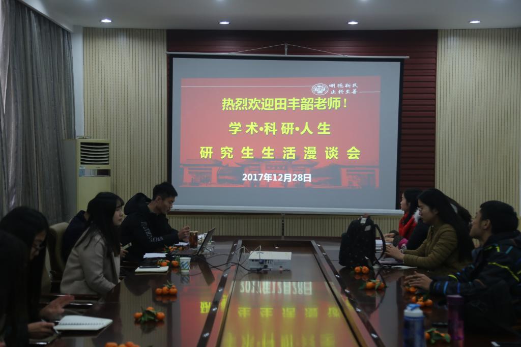 2017年12月28日下午,公司公共管理类研究生新生“学术•科研•人生”生活漫谈会举行。公共管理系田丰韶老师和优秀研究生代表、2015级社会保障专业研究生程茜受邀参加。公司17级全体公共管理类研究生积极与会。