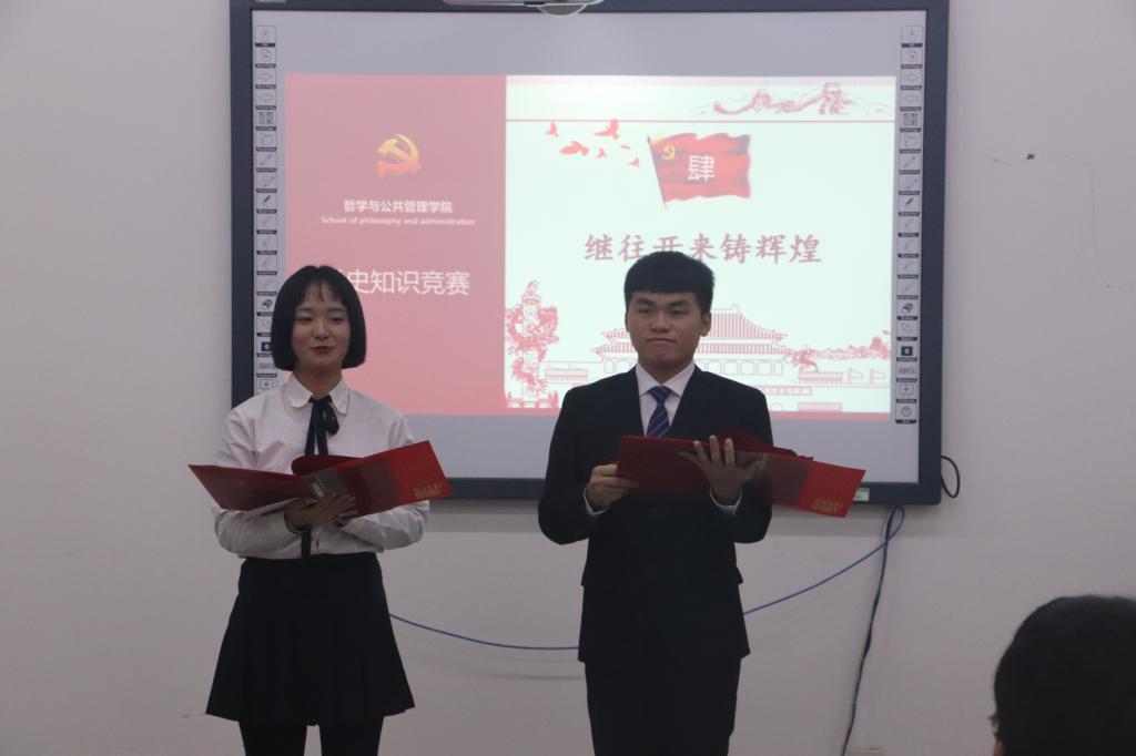 第一环节“扬帆起航圆梦想”,各队根据文字、图片、音频、视频等线索排除错误信息并回答党史名词,选手们沉着应对,冷静分析,初步展现了丰富的党史知识储备。第二环节“阔步前行谱华章”采取抢答形式,参赛队伍你争我夺,积极抢答,各展锋芒,比赛氛围瞬间变得紧张激烈。随着比赛的持续进行,比分差距逐渐拉开。第三环节“砥砺前行铺画卷”中各团队“亲友团”纷纷助阵其中,相关党史词句对答如流,令人拍手称赞。第四环节“继往开来铸辉煌”为风险比拼环节,比赛题目涵盖科学论断、红色诗句、著名党内人物、党的重要会议等,涉猎广泛。尽管比赛剑拔弩张好不紧张,各队成员卯足劲头,力争上游,默契配合中展现不俗的硬实力,赢得观众阵阵掌声。