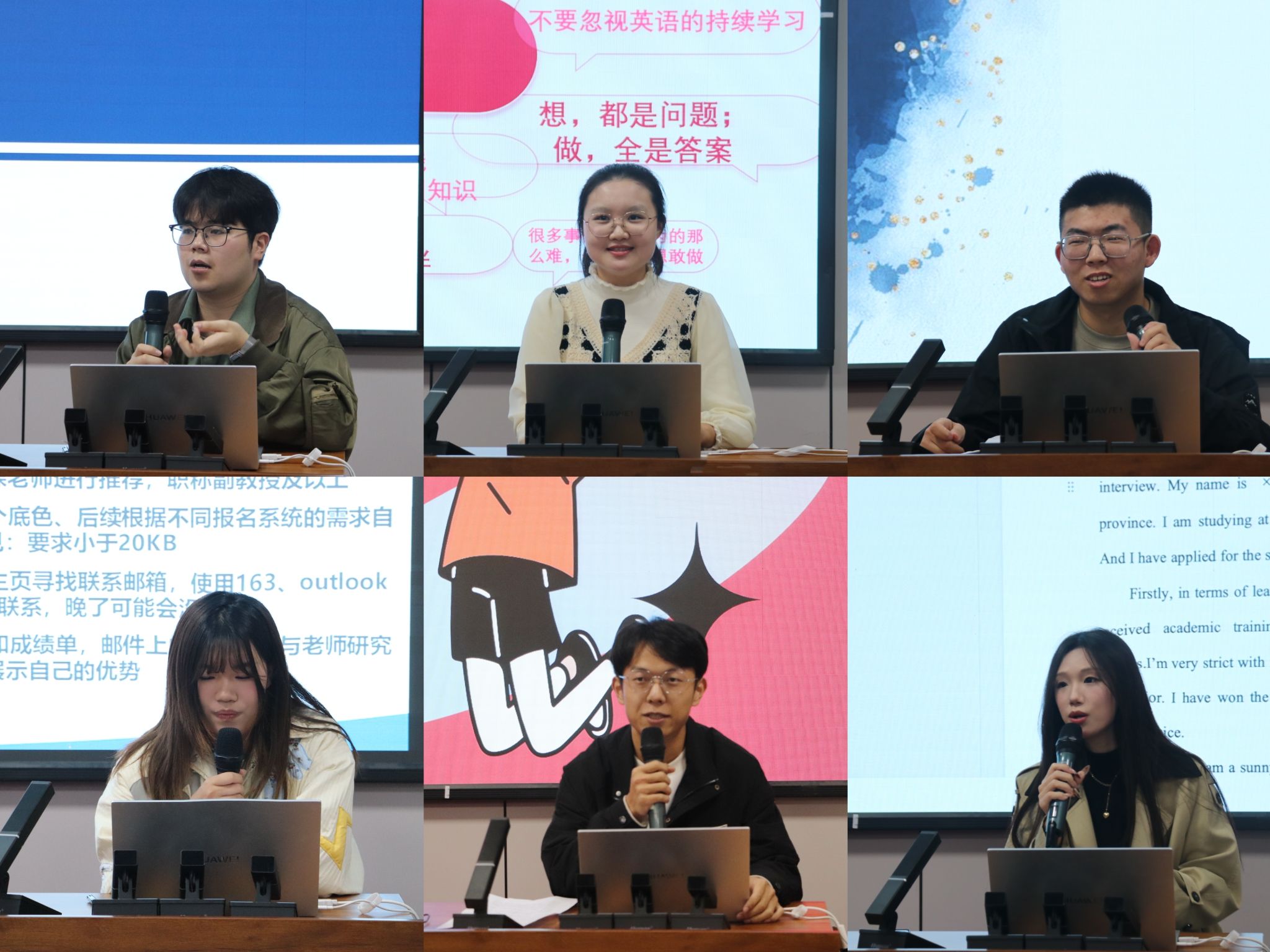 行政管理专业王泽臣结合自身保研经验,仔细分析了不同年级的同学应如何规划老员工活并鼓励大家在实践中积累经验,打牢基础。李董祺从日常学习、学术科研、大型竞赛、英语学习四个方面进行分享,她建议大家要全面提升自己的能力以及针对目标院校招生需求有侧重地发展自我。哲学专业丁煜惠从保研流程、材料准备、面试技巧、心态调节等多个方面建议大家要调整心态,迎难而上。张育鑫从自己的保研经历出发,鼓励大家及时制定计划,不断探索与尝试,要敢投敢报,及时调整方向,把握住一切能被录取的机会。劳动与社会保障专业陈浩翔从合理分配时间建议大家要将有限的精力投入到有意义的事情上。社会工作专业汪心怡从提升学业的重要性角度鼓励大家希望能不断提升专业水平,把握课堂学习,珍惜校园生活,不断提升自我。