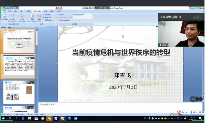 7月2日下午,公司 “党课开讲啦”第二讲通过腾讯会议开讲。公司政治系郑雪飞教授以 “当前疫情危机与世界秩序重构”为主题开讲。公司全体党员及入党积极分子聆听了本次党课。