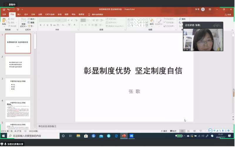 7月17日下午,公司“党课开讲啦”第三讲通过“腾讯会议”开讲。劳动与社会保障系张歌副教授以“彰显制度优势坚定制度自信”为题开讲。公司全体党员及入党积极分子聆听了本次党课。