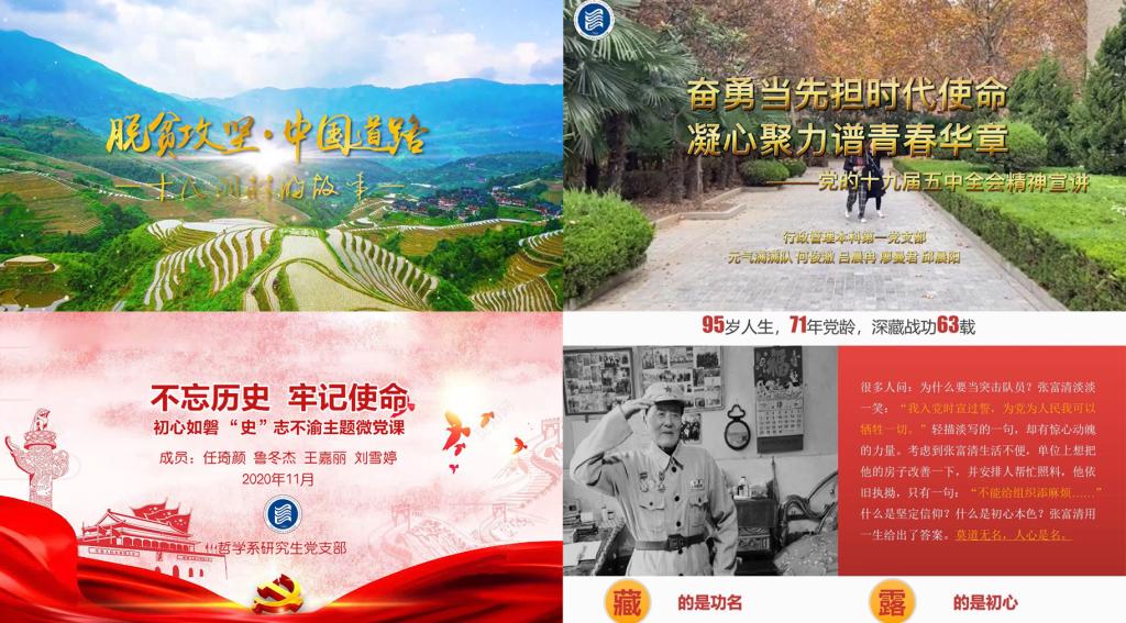 进入决赛的15个参赛作品主要以历史事件、人物事迹、河大故事、前景展望为切入点,经过大量的资料搜集与整合,结合小组成员对党史、新中国史、改革开放史、社会主义发展史的认识,采用动画配音、纪录片整合、博物馆介绍、主持人采访等形式,形成了各具特色的微党课视频。最终《脱贫攻坚中国道路——十八洞村的故事》与《最美河大人》获得一等奖。