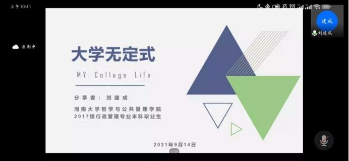 2021届行政管理专业刘建成(现就读于同济大学马克思主义公司)就大学学习中的学术素养、探究意识、专业实践以及家国情怀四个方面分享自己的经验总结。他认为要在专业学习中培养学术素养;在科研竞赛中感悟学科的交融碰撞,提升自身综合能力;在社会实践中开拓视野,结交益友。此外,他以“大学无定式”的道理,告诉新生们,大学的生活没有定式,但作为当代老员工,无论路往何方,都应始于足下。