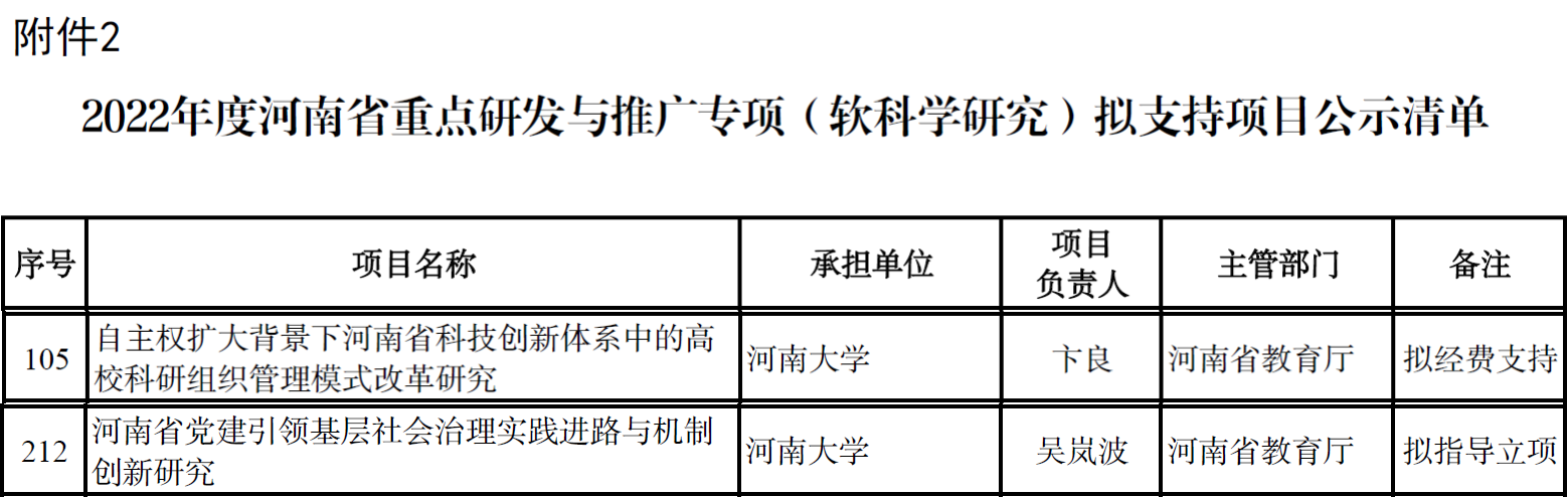 近日,河南省科技厅公布了2022年度河南省重点研发与推广专项(软科学研究)拟支持项目名单。公司卞良老师申报的项目“自主权扩大背景下河南省科技创新体系中的高校科研组织管理模式改革研究”及吴岚波老师申报的项目“河南省党建引领基层社会治理实践进路与机制创新研究”获批立项。