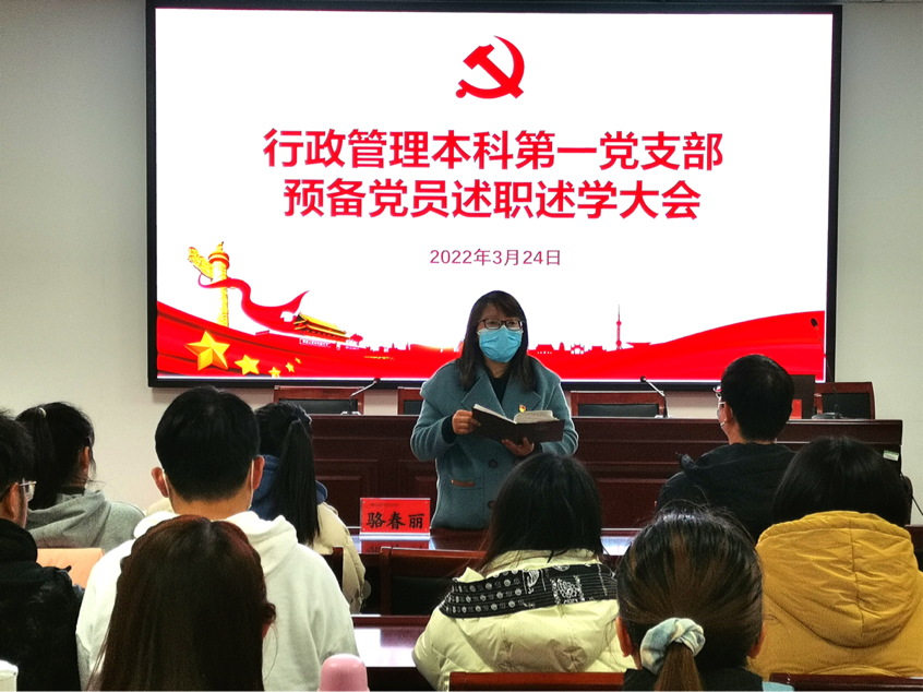 为加强党员教育管理,发挥先锋模范作用,促进支部党员之间的交流与学习,3月24日上午,365英国上市公司行政管理本科第一党支部在公司第三会议室召开预备党员述职述学大会。党支部书记骆春丽、本科2019级辅导员孙少飞和支部27名党员参加会议。