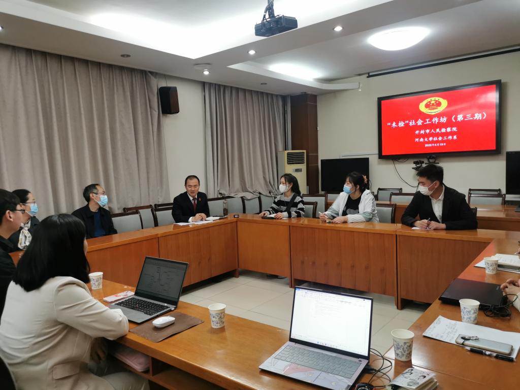 2022年4月19日上午,第三期“未检”社会工作坊在开封市人民检察院四楼会议室举行。本期工作坊在对一学年来公司参与的涉案未成年人帮教工作进行总结研讨的基础上,谋划下一阶段司法社会工作的思路和框架。公司社会工作系白雪苹、付光伟两位老师和2020级社会工作专业本科生代表聂晓彤、赵俊培、王立宸参与了此次活动。此次工作坊由开封市人民检察院第七检察部赵永建副主任主持。与前两期工作坊不同的是,郑州市金水区青荷橄榄社会工作服务中心作为开封市检察院购买社会工作服务的承接方也应邀参加了此次活动。