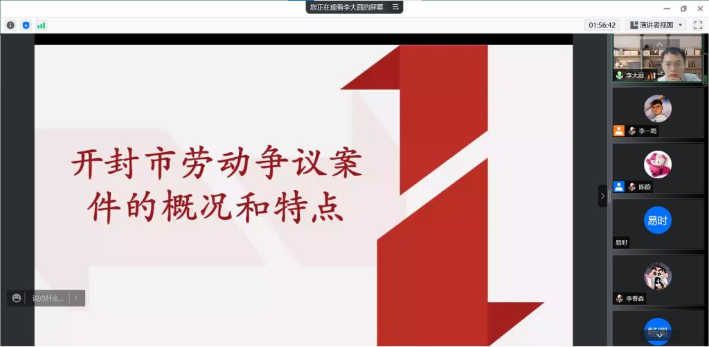 吕静首先对开封市近年来劳动争议调解、仲裁的概况及特点进行了介绍。她表示,2017年至2021年五年间,开封市劳动争议仲裁院的案件调解率保持在60%以上,劳动争议仲裁的特点也趋向主体多元化、诉求多元化、案件群体化。随后,吕静分别从案件受理范围、劳动关系认定、案件事实查明等方面对劳动争议案件处理常见的问题讲解,就近期热点的竞业限制、新就业形态劳动关系认定、建筑业工伤赔偿的特别拟制、女性平等就业与特殊保护等问题进行了交流。