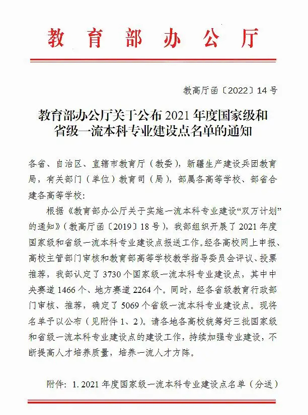 近日,教育部办公厅公布了《2021 年度国家级和省级一流本科专业建设点名单》(教高厅函〔2022〕14 号),公司劳动与社会保障专业入选国家级一流本科专业建设点,社会工作专业入选省级一流本科专业建设点。