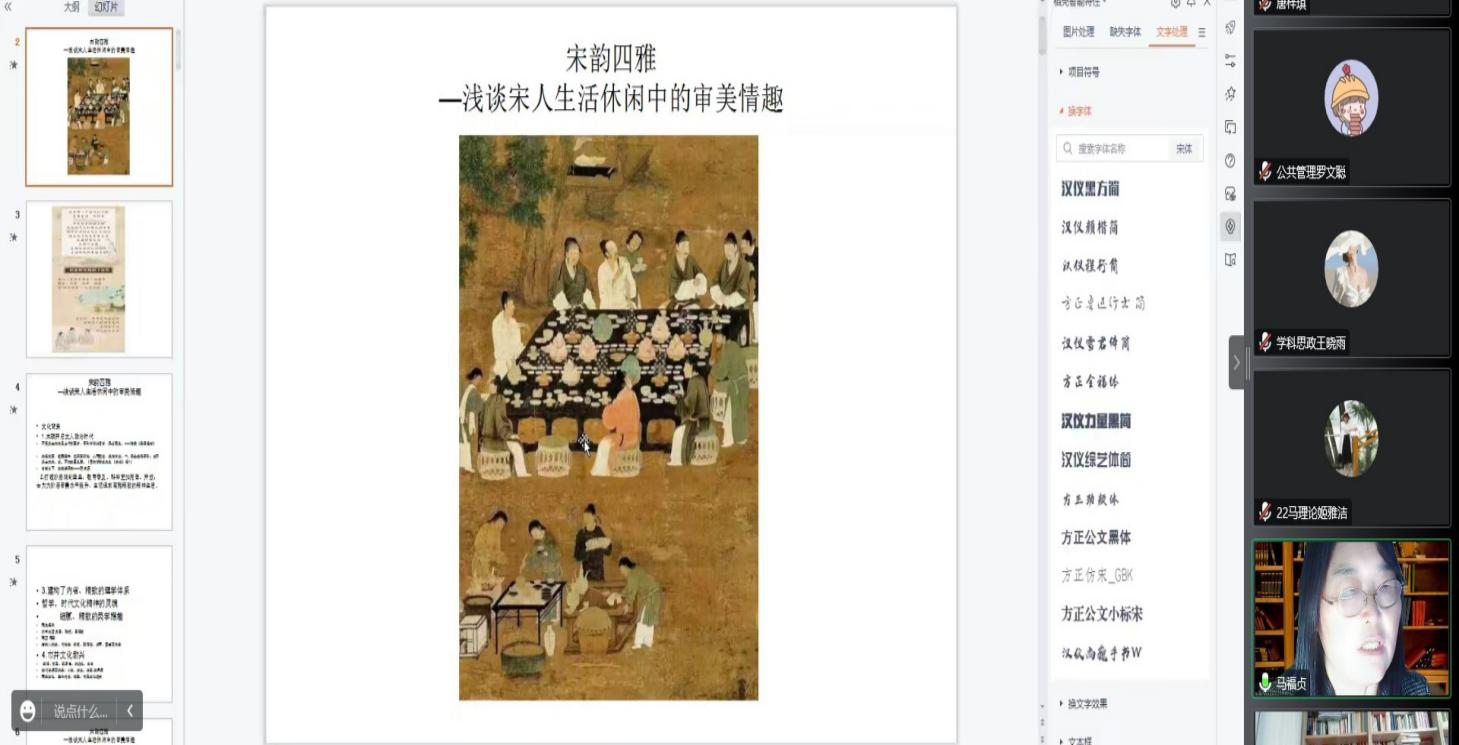10月31日下午,公司马福贞副教授在线作了题为《宋韵四雅——浅谈宋人生活休闲中的审美情趣》的报告,讲座由杨红玉副教授主持,公司师生通过线上的方式共同参与了此次讲座。