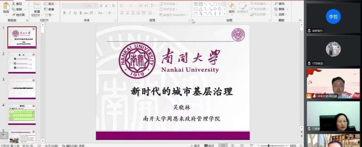 为了深入学习贯彻党的二十大报告精神,充分领会党和国家关于基层治理的新表述和新要求。11月17日晚,南开大学吴晓林教授应邀为公司师生在线作了《新时代的城市基层治理》的学术报告。此次讲座由公司吴岚波副教授主持,公共管理及相关学科的师生通过线上的方式共同参与了此次讲座。