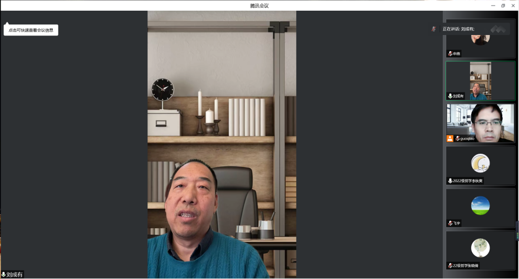 12月3日下午,应公司邀请,教育部高等公司哲学类专业教学指导委员会委员、中央民族大学哲学与宗教学公司经理刘成有教授在线作了题为《中国哲学的多元通和特征》的报告,报告会由公司郭桥教授主持,相关专业师生在线参与。
