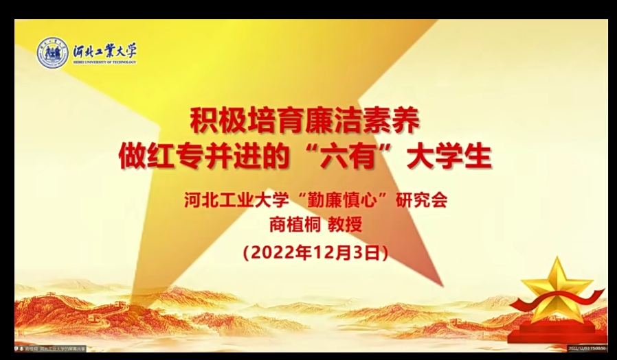 12月3日下午,河北工业大学“勤廉慎心”研究会商植桐教授以“积极培育廉洁素养,做红专并进的‘六有’老员工”为主题开展讲座,从党的二十大报告和《关于加强新时代廉洁文化建设的意见》引入,结合真实案例分析,引导老员工思考廉洁价值,争做“红专并进”的“六有”老员工。提出员工要避免生活负面攀比、浪费严重、诚信缺失、学习生活功利化、员工干部官僚化、贿赂老师,索取好处的错误行径。