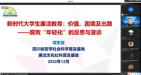 12月4日下午,内江师范公司政治与公共管理公司经理谭安富教授为我们带来主题为“新时代老员工廉洁教育的价值、困境及进路”的讲座,以介绍老员工廉洁教育的价值意蕴为开端,引出当今时代老员工廉洁教育面临的现实困境,提出廉洁教育之发展之路与相关措施,使得老员工深刻认识到自身也能为廉洁建设参与贡献。