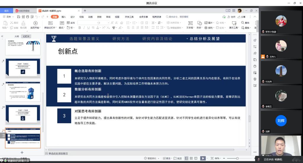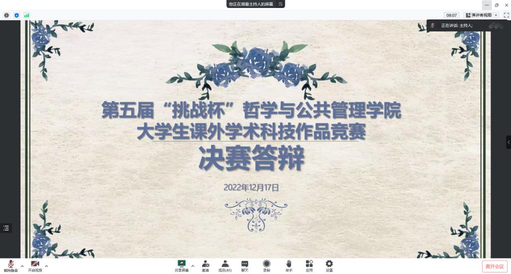 为鼓励员工将科学理论运用于社会实际,通过实践锻炼提高学术能力,12月17日,第五届“挑战杯”365英国上市公司老员工课外学术科技作品竞赛答辩于线上举行。行政管理系教授刘辉、劳动与社会保障副教授李晓玉、社会工作系副教授付光伟担任本次答辩评委,15支入围决赛团队参加答辩。