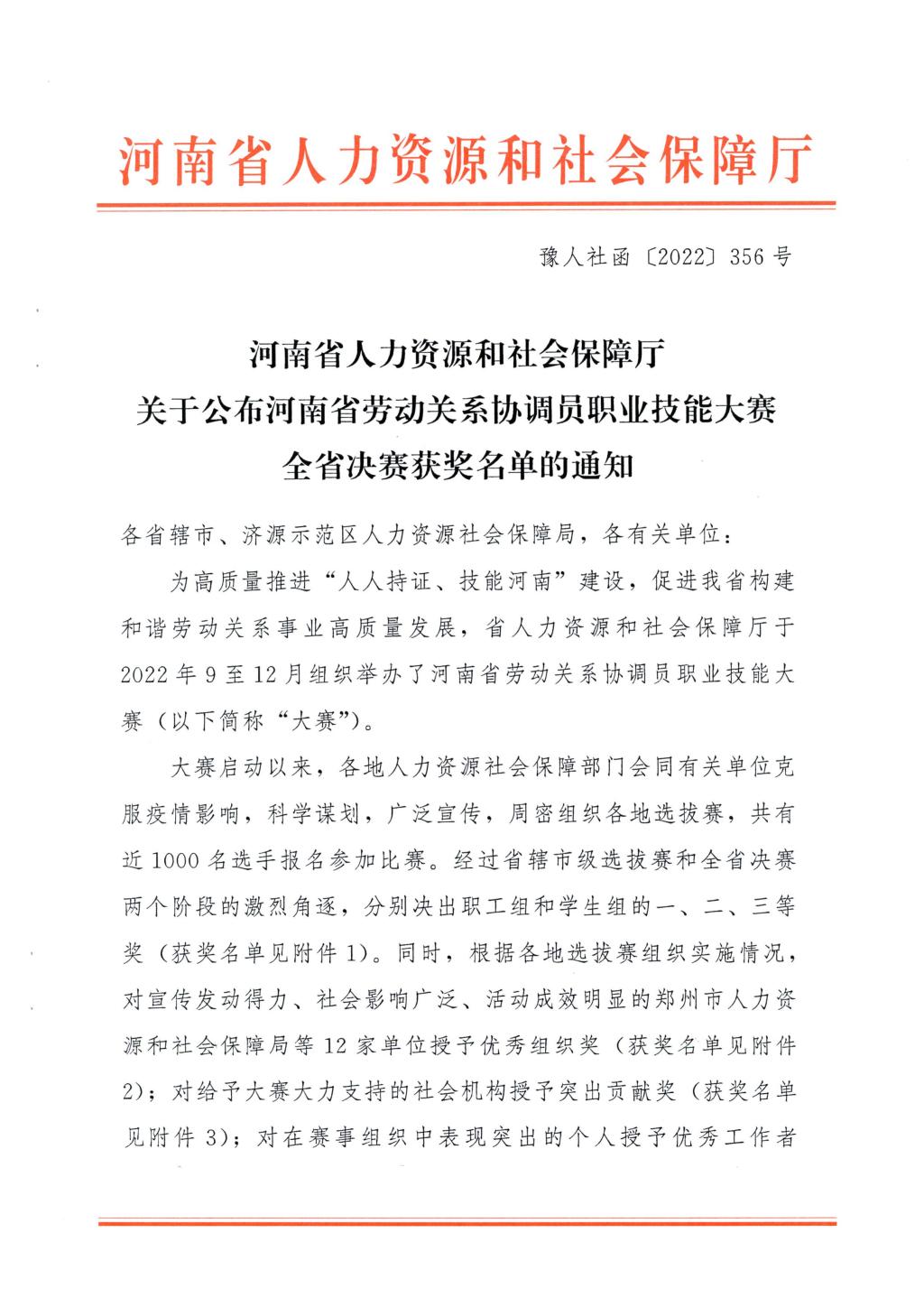 日前,河南省人力资源和社会保障厅公布了“河南省劳动关系协调员职业技能大赛”全省决赛获奖名单(豫人社函【2022】356号)。公司劳动与社会保障本科专业2019级员工刘珂欣、张瑞敏和2020级员工赵艺哲获大赛员工组一等奖(全省员工组一等奖获奖人数仅4人),占全省员工组获奖总数的75%。2019级王振东获省级二等奖(全省员工组二等奖获奖人数仅5人)。365英国上市公司获突出贡献奖。