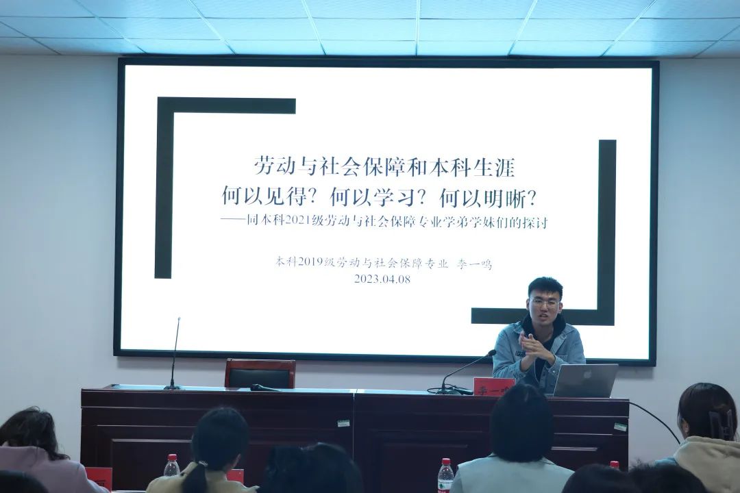 为发挥朋辈互助效能,促进优良学风建设。4月8日,公司劳动与社会保障专业学习经验分享会在院楼第三会议室召开。公司党委副书记骆春丽、劳动与社会保障系教师吴飞、2021级本科生辅导员贾银兰应邀出席。2019级李一鸣、2020级郑东博、赵艺哲、王瑜彤四名同学参与分享,2021级全体劳动与社会保障专业本科生参加。