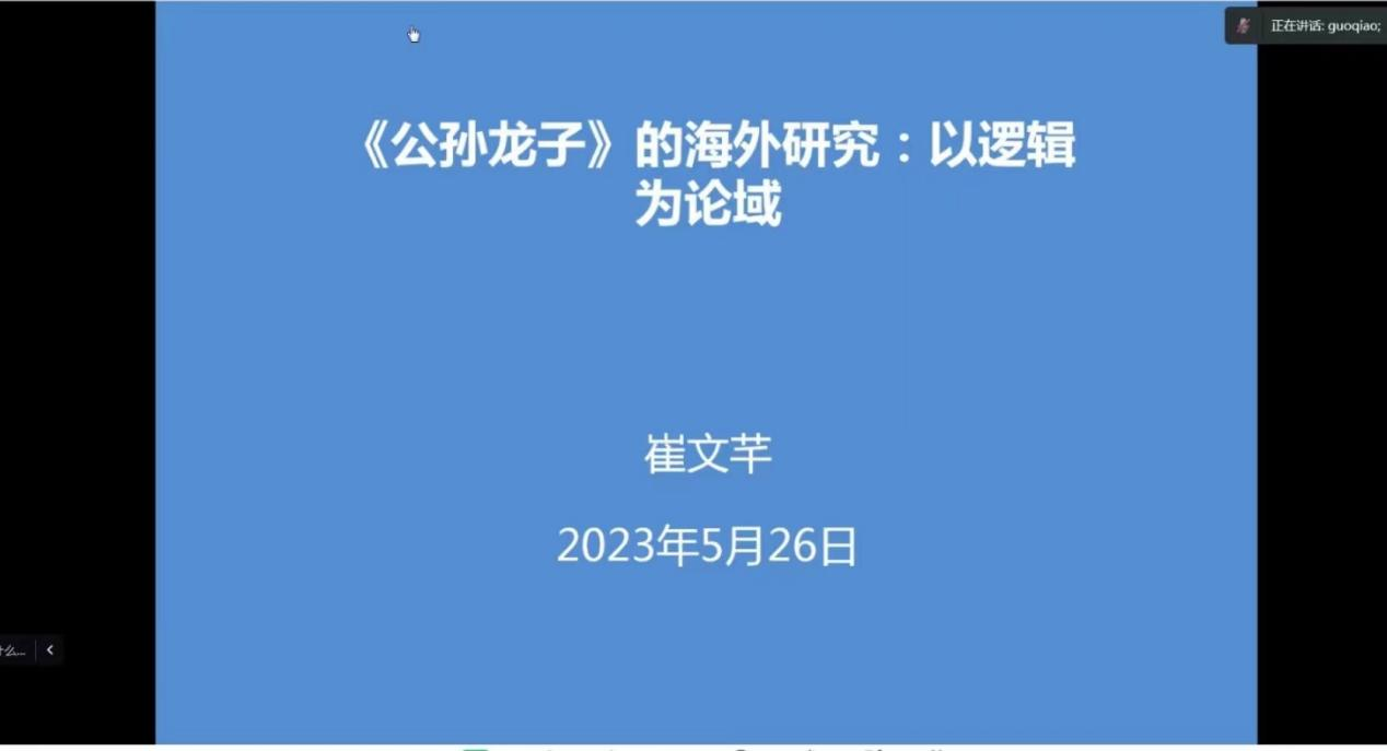 5月26日下午,应公司邀请,中国社科院哲学研究所崔文芊副研究员在线作了题为《〈公孙龙子〉的海外研究:以逻辑为论域》的学术报告。此次讲座由公司郭桥教授主持,哲学专业部分本科生、研究生以及部分教师通过线上的方式共同参与了此次讲座。