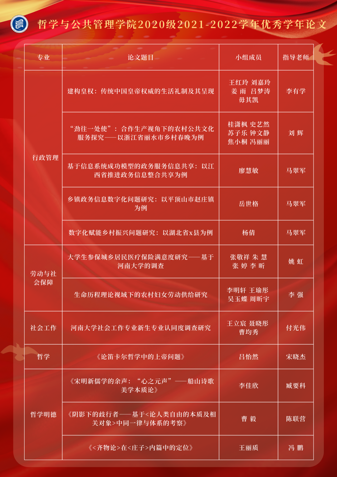 随后,田丰韶宣读了获奖团队及个人作品名单,共有王红玲团队《构建皇权:传统中国皇帝权威的生活礼制及其呈现》、桂潇枫团队《“劲往一处使”:合作生产视角下的农村公共文化服务探究——以浙江省丽水市乡村春晚为例》等十二篇优秀学年论文获奖。田丰韶、刘辉向获奖团队与个人表示祝贺并为获奖代表颁奖合影留念。