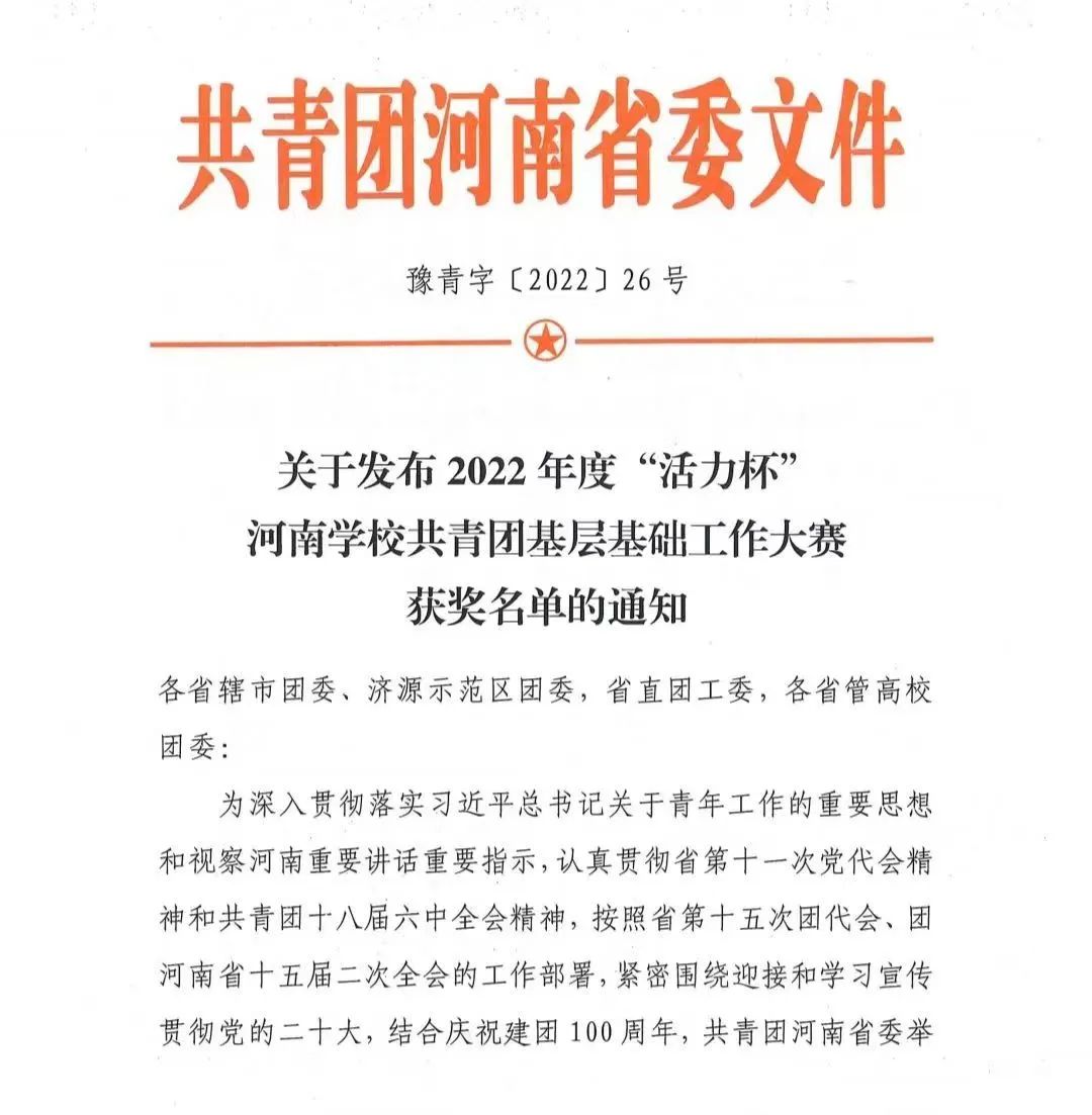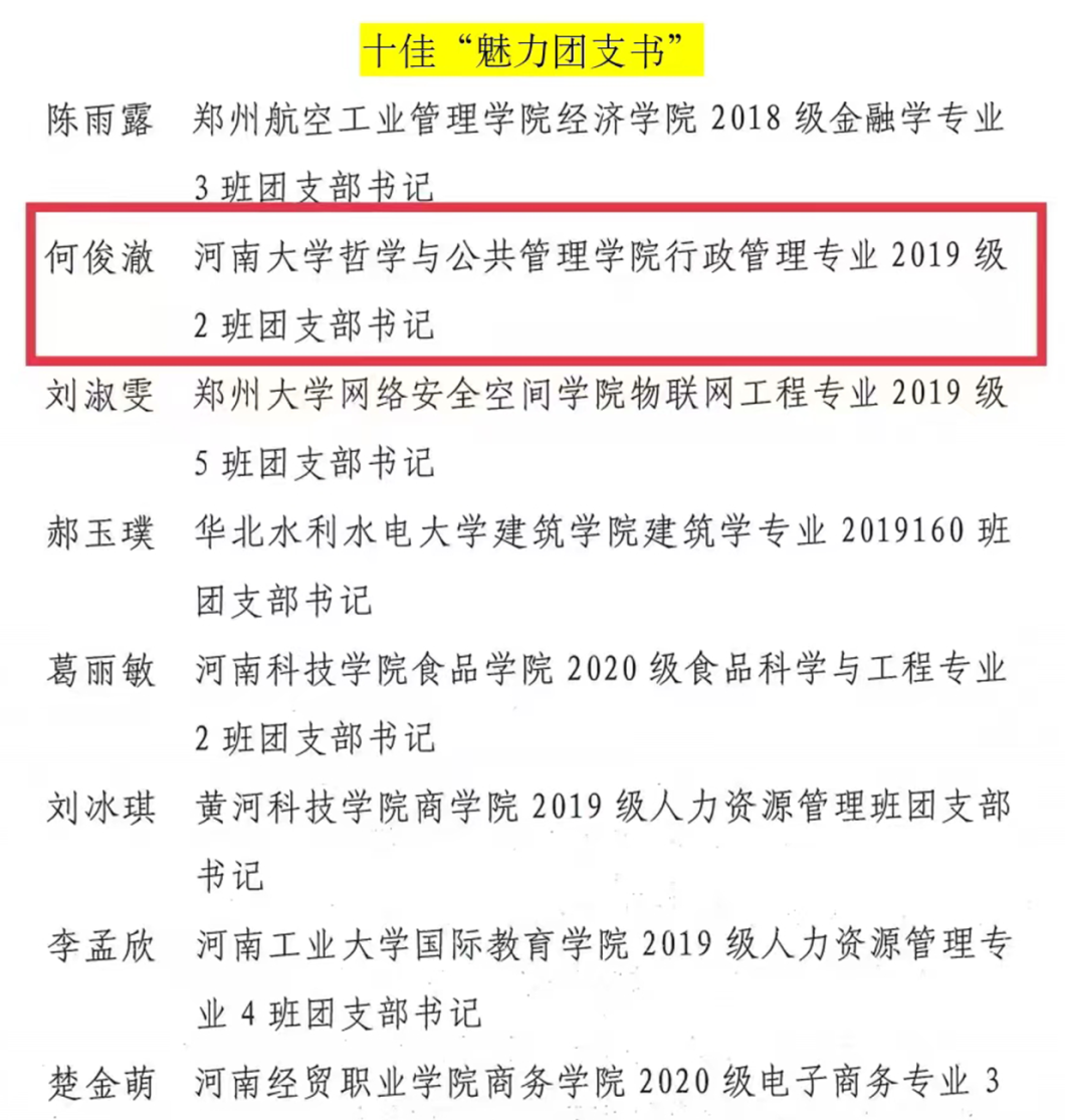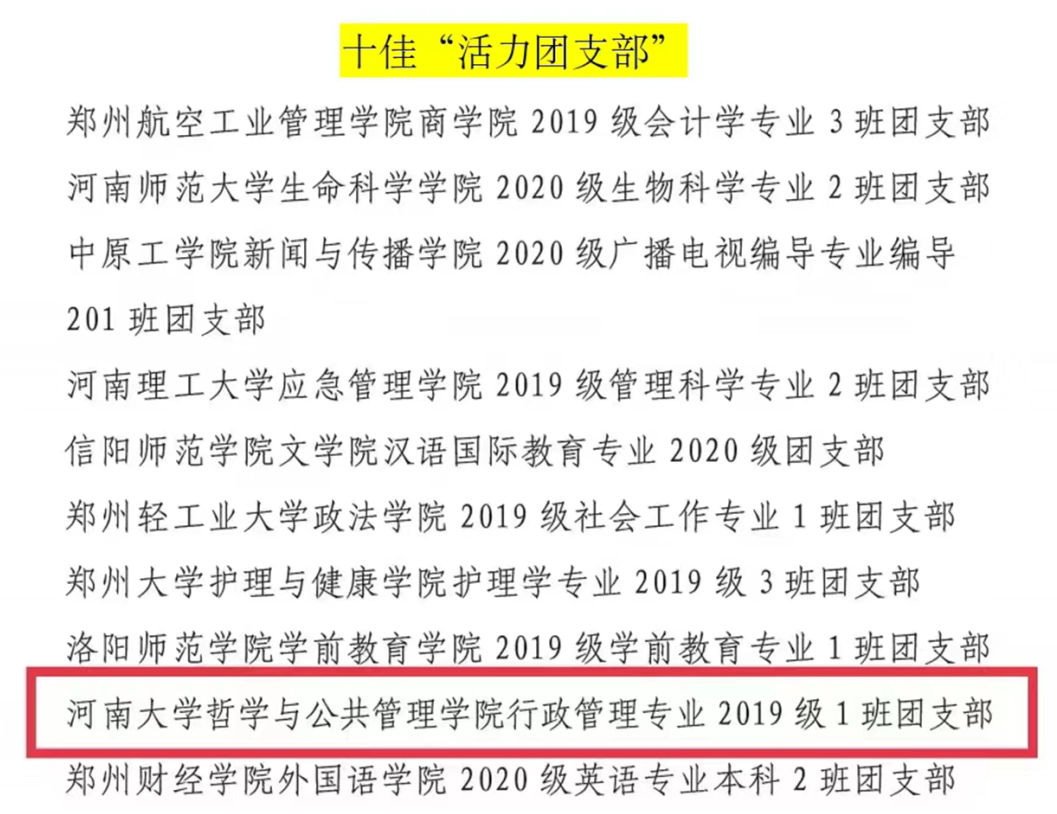 近日,共青团河南省委发布了2022年度“活力杯”河南公司共青团基层基础工作大赛获奖名单。公司“承前启后中国年,听说读写提能力”新年主题系列活动和“广博谦远,明理思哲”“哲管青年说”系列活动荣获共青团工作项目大赛一、三等奖,行政管理专业2019级1班团支部获十佳“活力团支部”奖项,行政管理专业2019级2班何俊澈获十佳“魅力团支书”称号。
