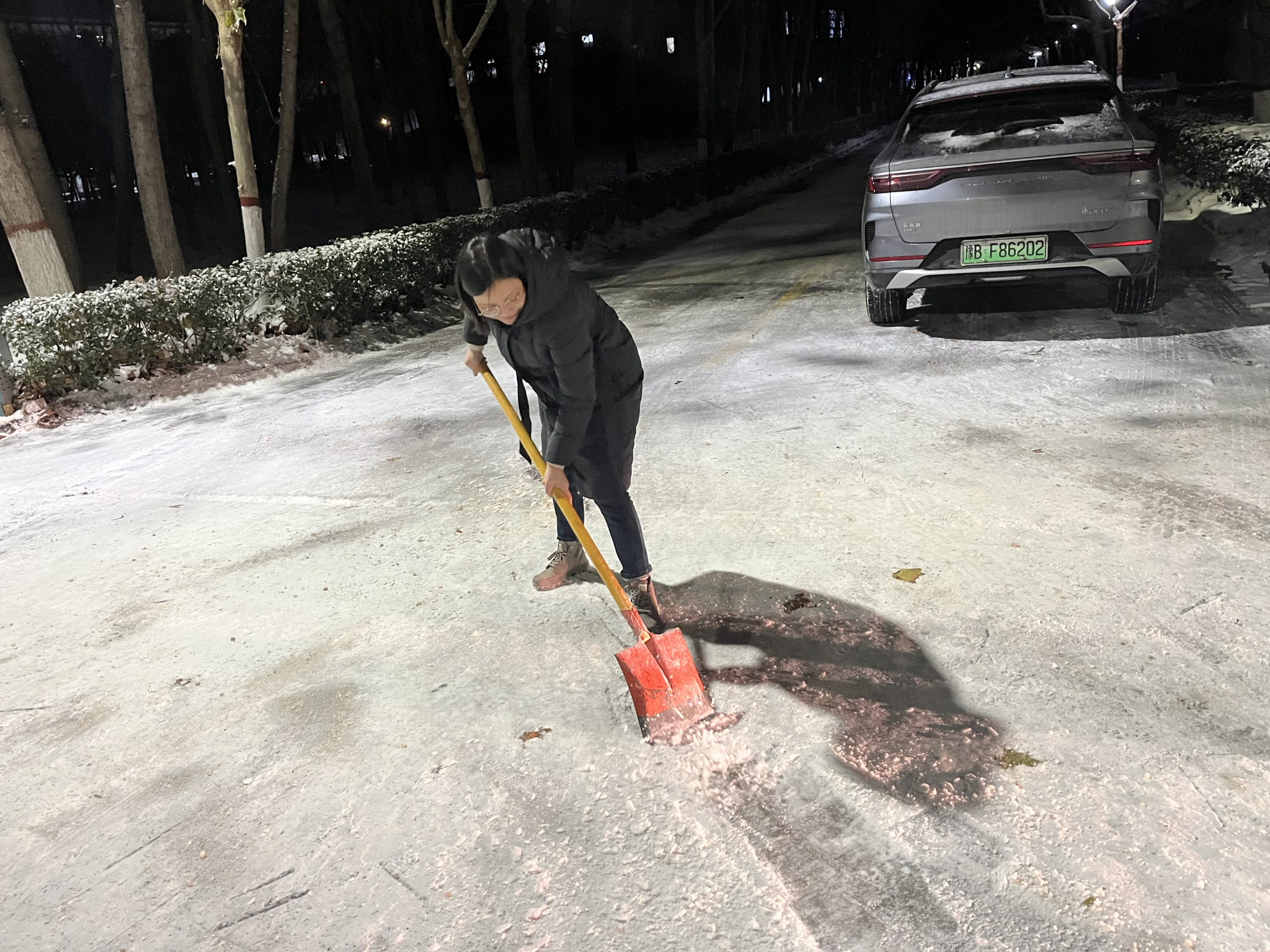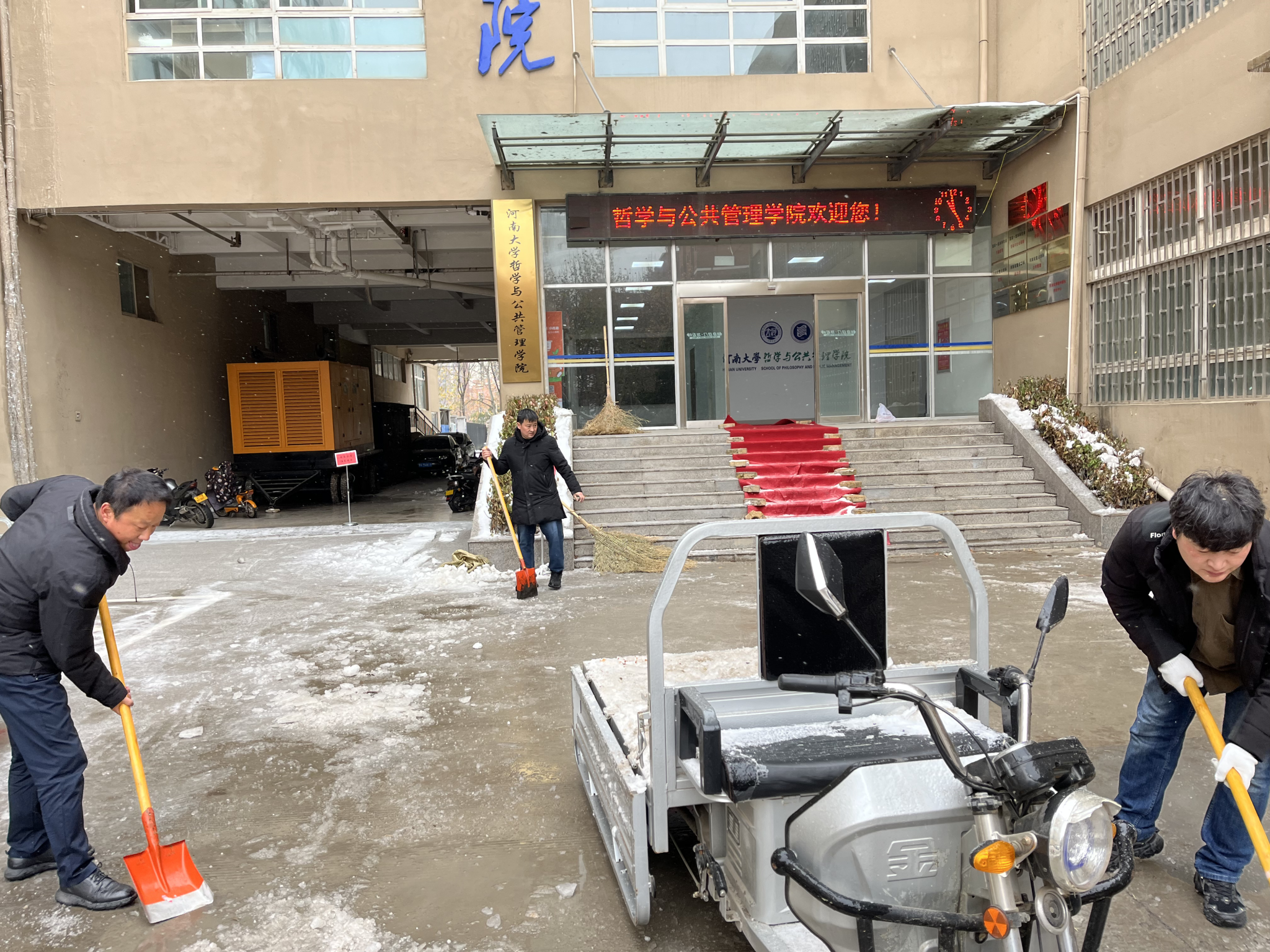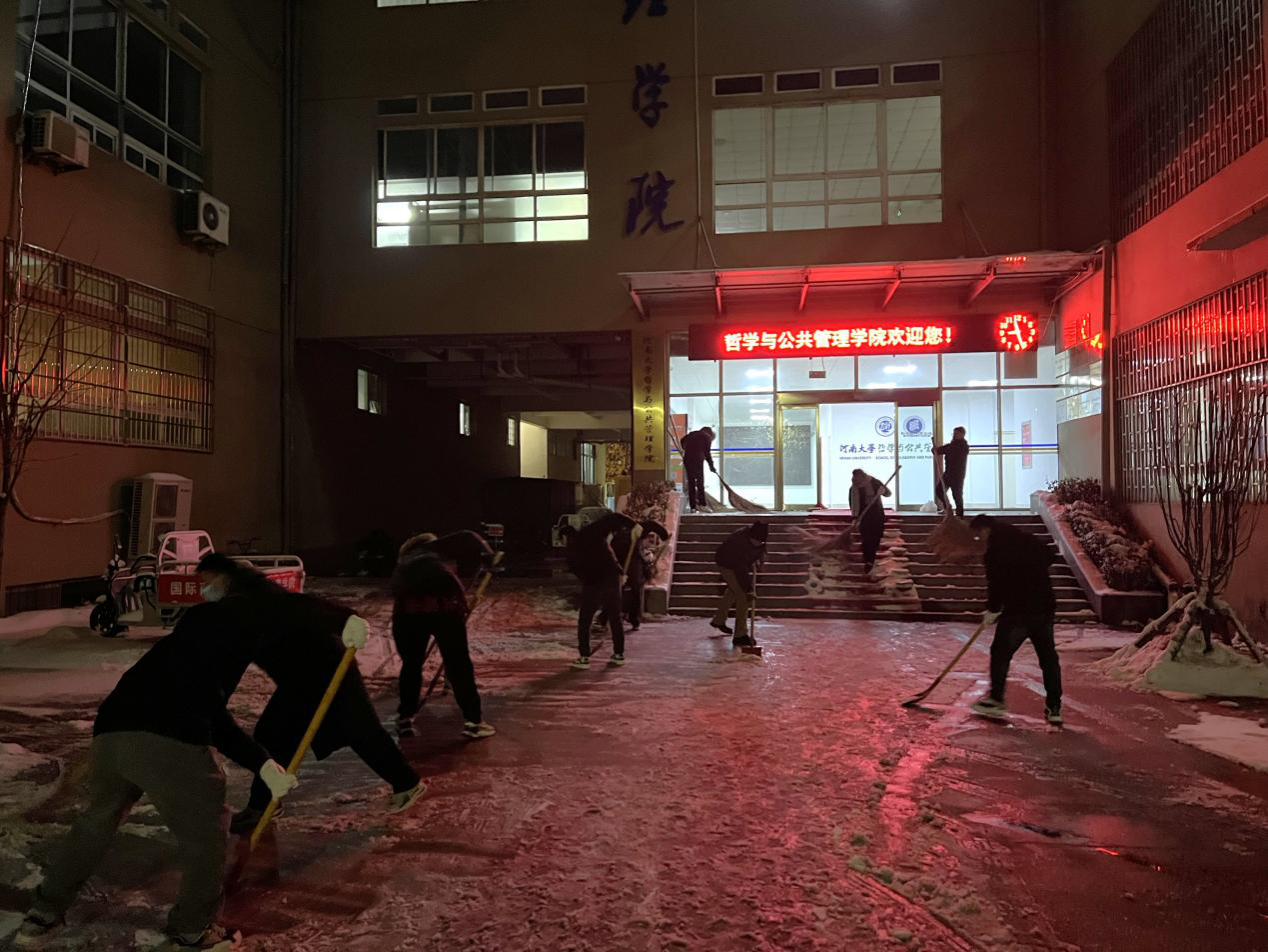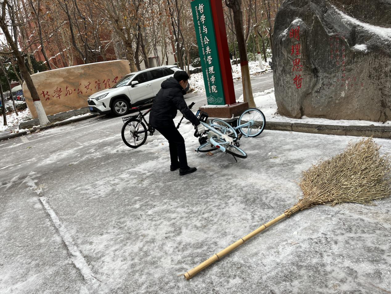 2023年冬雪初至,连续几日降雪为河大校园带来了一场银装素裹的美景,同时也造成了道路积雪、路面结冰等安全隐患。为保障广大师生的出行安全,尽快恢复正常的教学秩序,近日,在公司工会主席王晓东的带领下,公司工会积极响应公司和公司党委清扫积雪号召,从早上到晚上,多次对学楼和南苑餐厅路面上的积雪进行破冰清扫。
