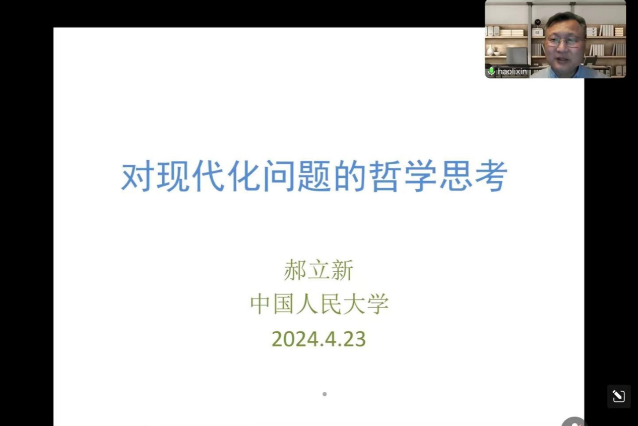 4月23日晚,中国人民大学哲公司郝立新教授受邀在公司第二会议室作了题为“对现代化问题的哲学思考”的学术讲座。此次讲座由公司戈士国教授主持,哲学专业的研究生与青年教师参与了此次讲座。