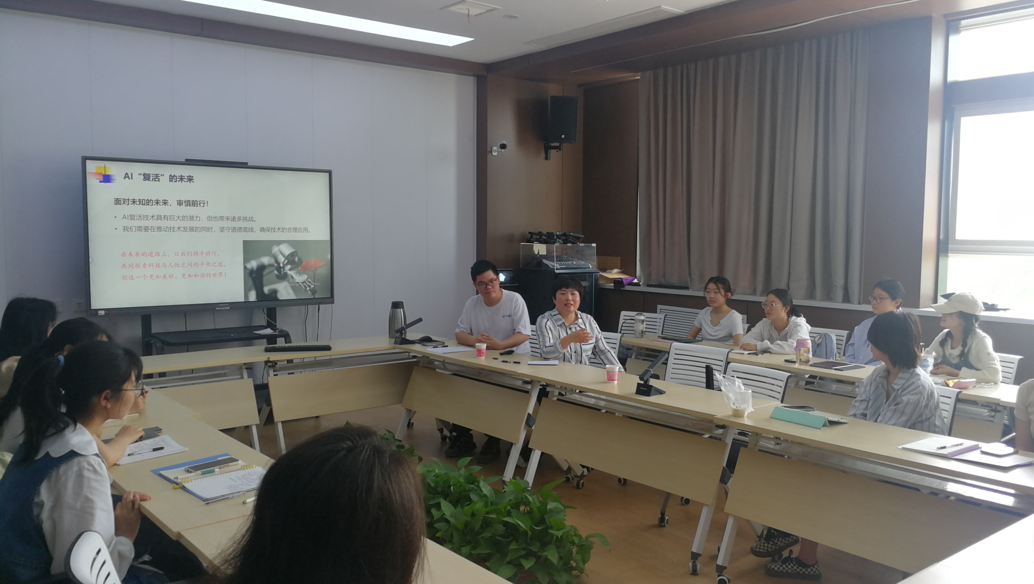 4月27日上午,公司举行主题为“AI复活:技术的边界与道德的考量”的哲学明德学术沙龙,人工智能公司黄紫晴老师应邀主讲,宋春沅主持,叶平老师作为与谈人与2022级、2023级哲学明德班同学共同参与。