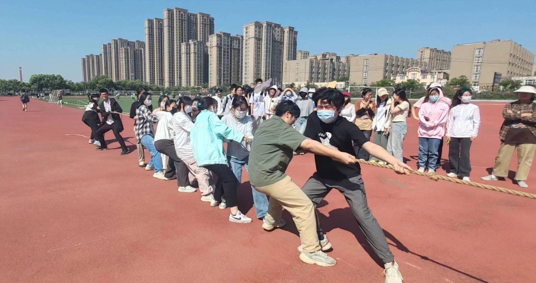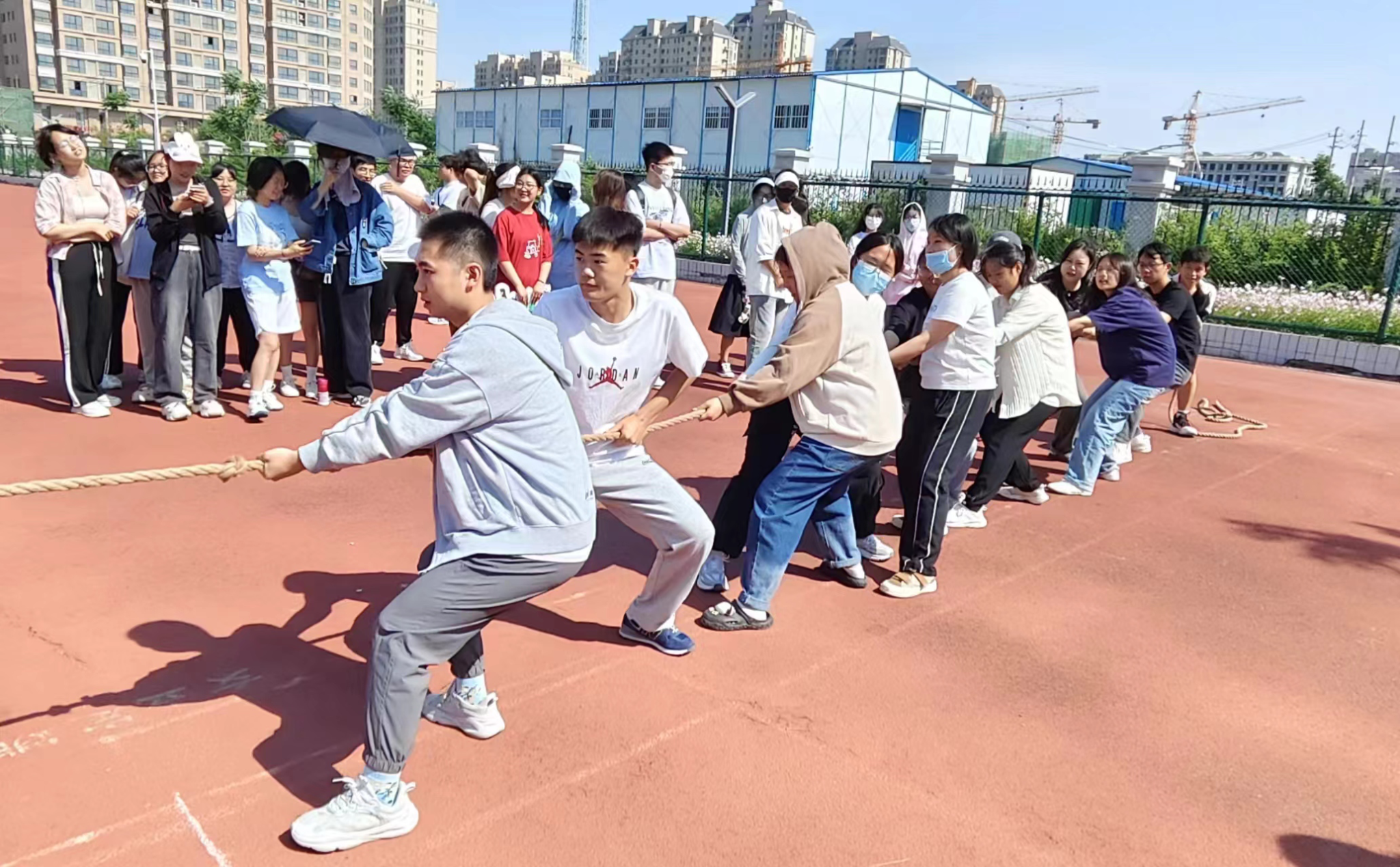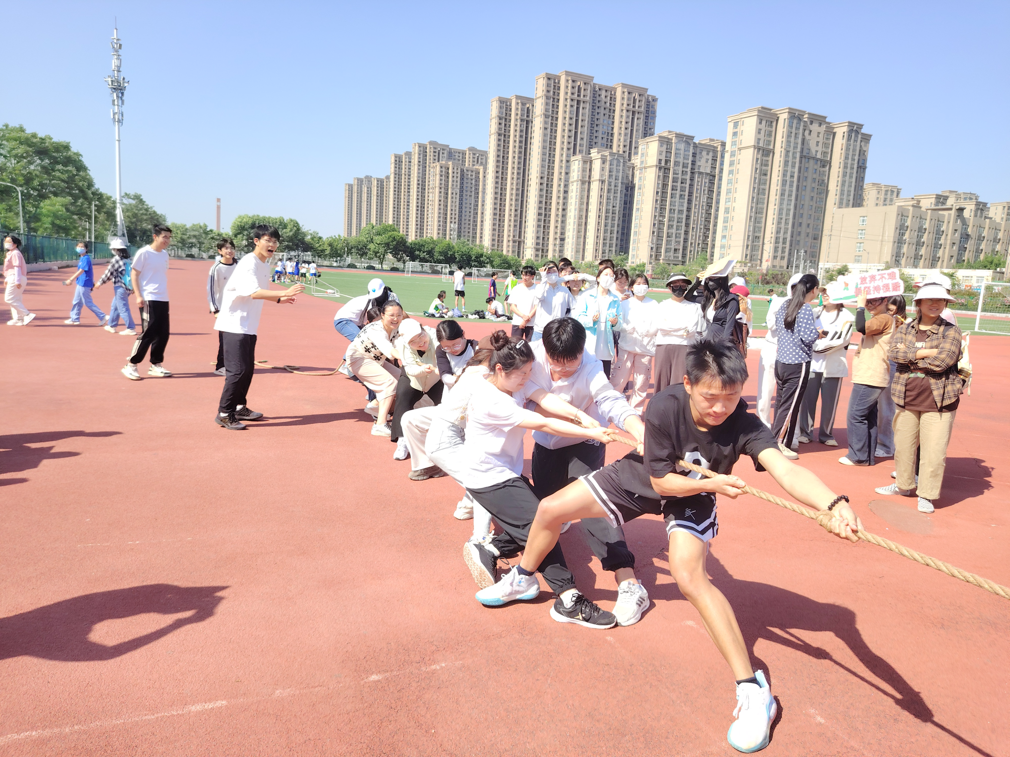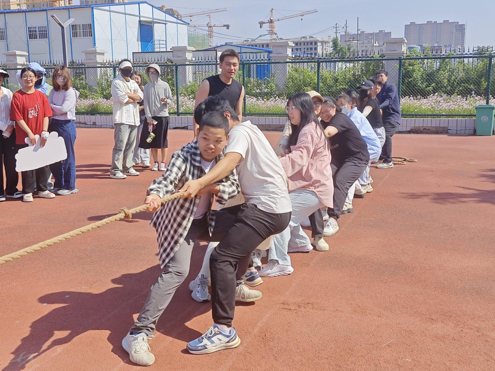 一根麻绳,紧紧连着两支队伍。随着一声哨响,同学们卯足力气,双手紧握麻绳,双脚用力着地,个个身体后仰,纷纷使出“洪荒之力”,只见拔河绳上的红色标记一会向左,一会向右,难分伯仲。赛场边,老师同学们秒变啦啦队员,“一、二,加油!一、二!加油!”加油声、助威声此起彼伏,飘荡在整个操场。整个赛事紧张激烈、精彩不断、扣人心弦。
