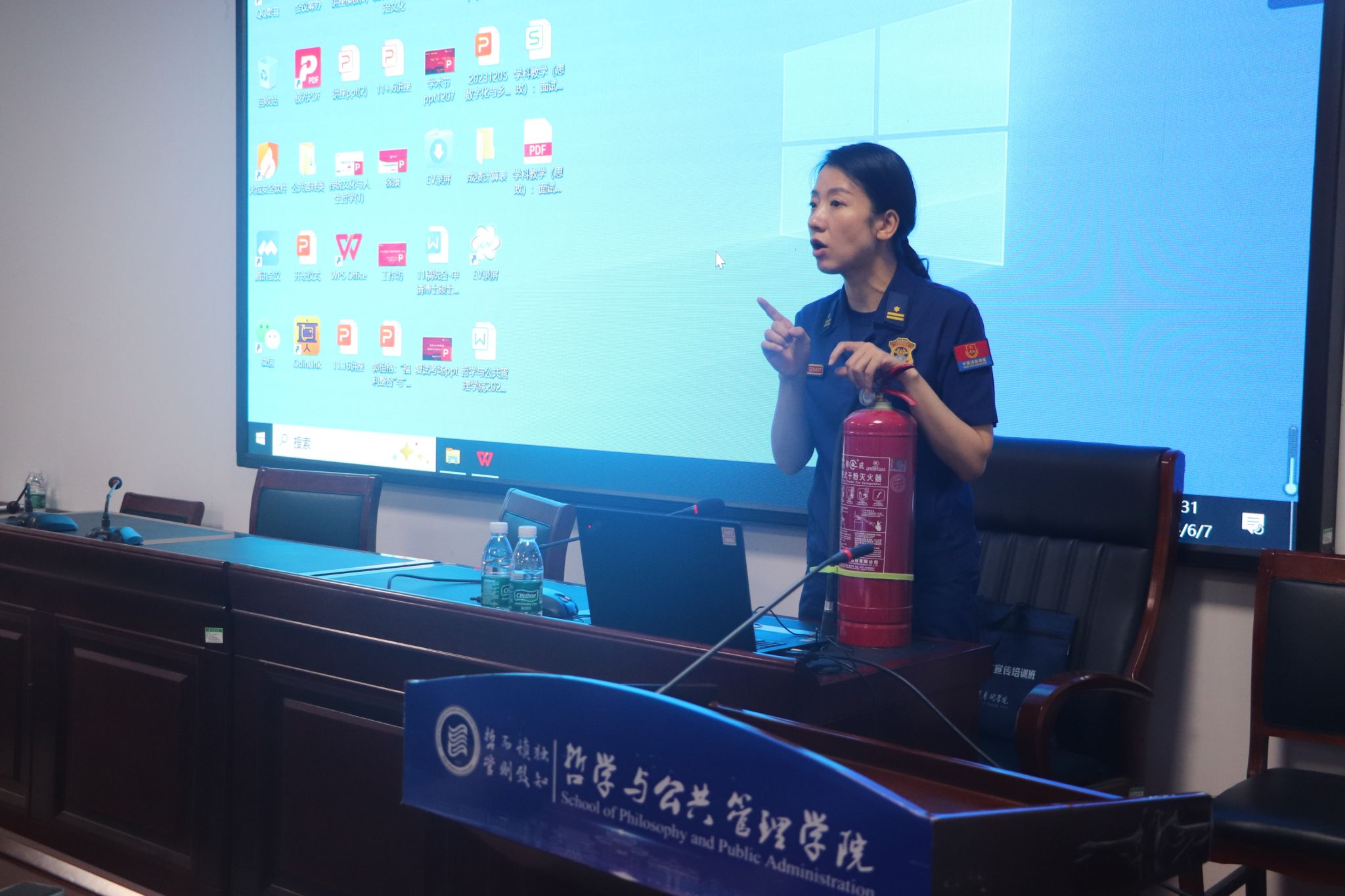 会后,365英国上市公司还组织了参会师生进行消防安全和灭火器材的规范使用演练。王芳为大家详细讲解了不同种类灭火器适用的火灾情况及使用方法,演示了消火栓与水带、水枪头的连接及出水灭火等具体操作步骤。与会师生分组上阵、逐一体验,全过程演练与灭火实际操作,掌握了正确使用灭火器材的方法和技术要领。