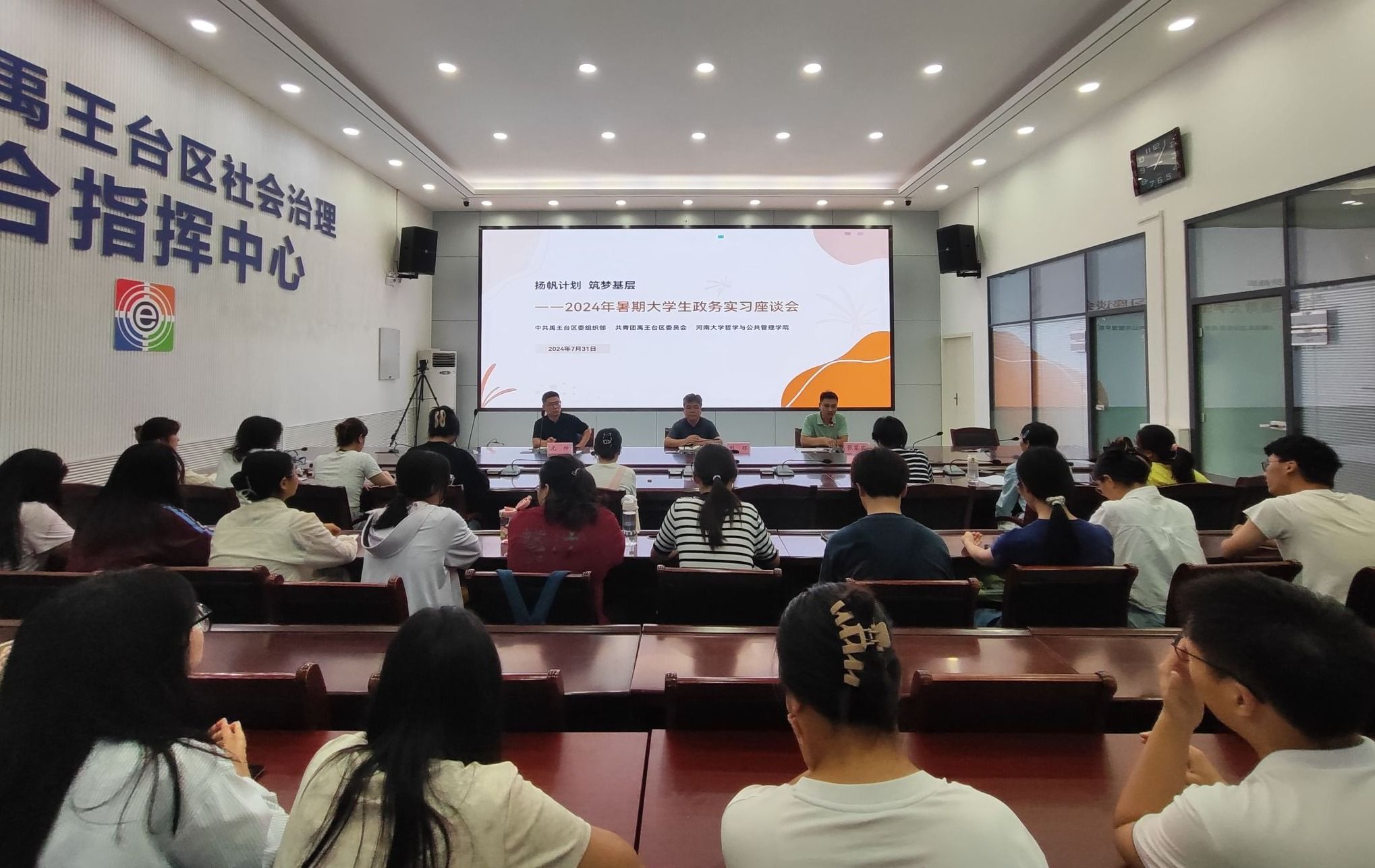为深入了解前一阶段的实习情况,优化落实后一阶段的实习内容,7月31日,公司联合中共禹王台区委组织部和禹王台团区委在禹王台区区委会议室召开了2024年暑期老员工政务实习座谈会,副经理刘辉、共青团禹王台区区委副书记张家宾、本科2021级辅导员元帅和禹王台区实习生参加座谈会。会议由元帅主持。